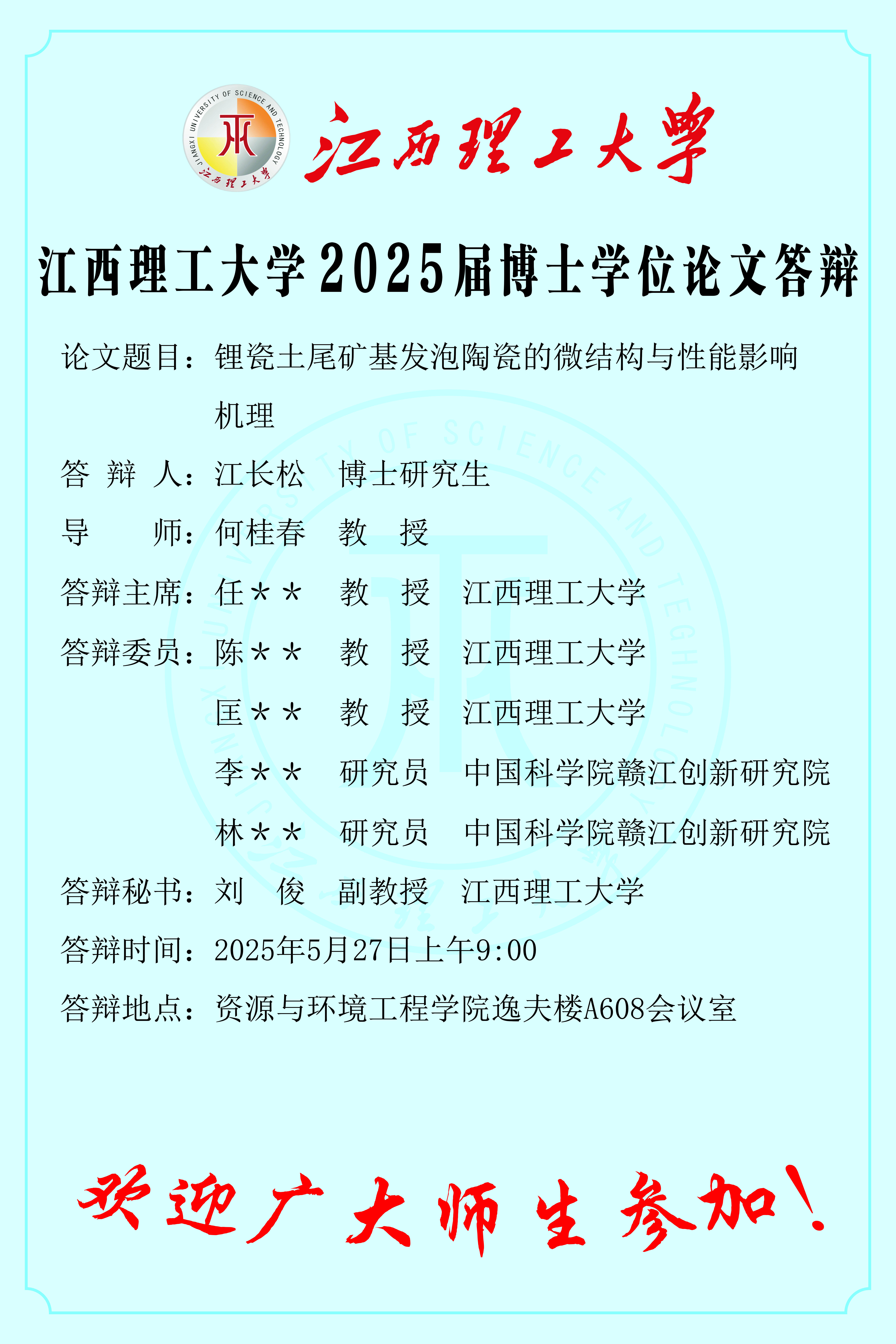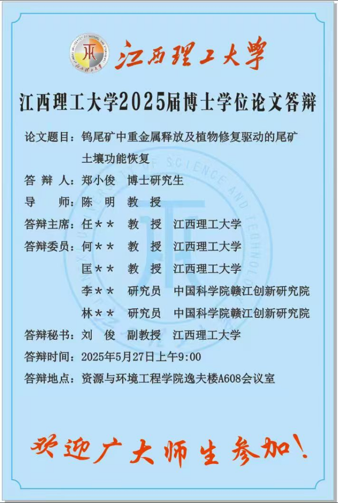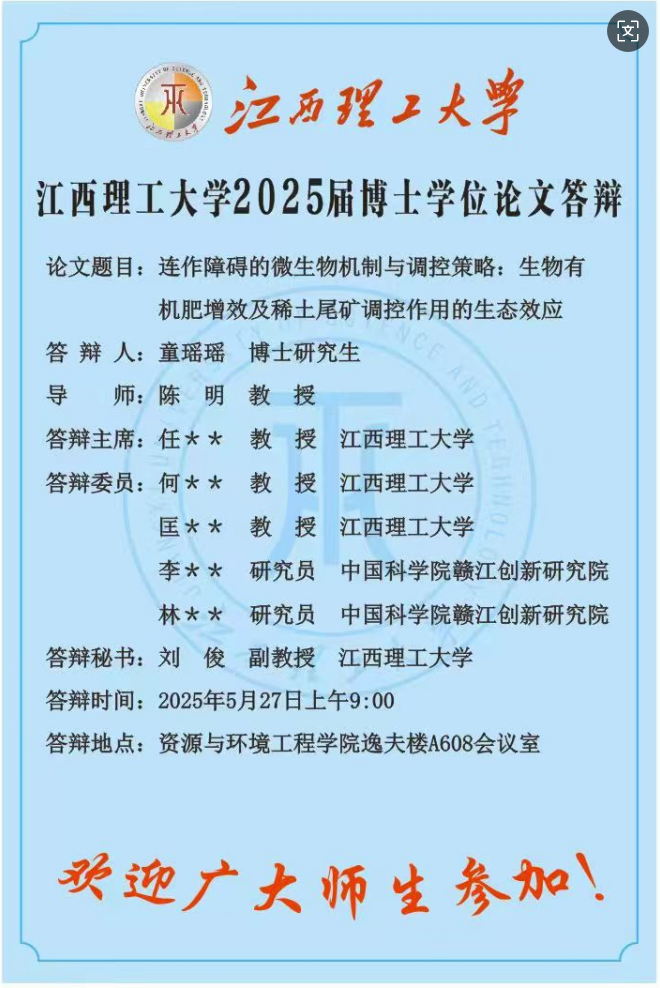 江西理工大学2025届博士学位论文答辩(5月27日)