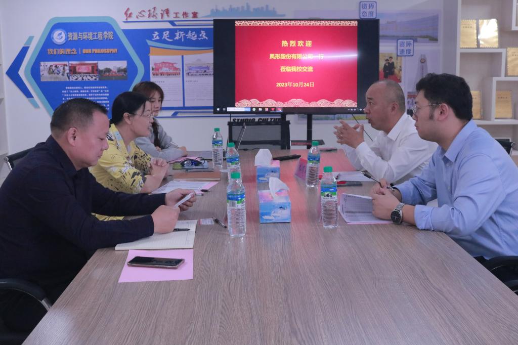 本网讯 10月24日,凤形股份有限公司副总经理朱有润、人资行政经理徐旭峰一行来校交流,我校资源与环境工程学院院长何桂春、党委副书记张春雷接待了朱有润一行并在黄金校区校区逸夫楼A618会议室举行座谈交流会。会议由张春雷主持。